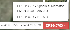 A ferramenta de mudança de sistema de coordenadas, permite ao utilizador alternar o sistema de coordenadas base do mapa principal. Ao clicar sobre o identificador do sistema de coordenadas actual do mapa, serão apresentados os sistemas coordenadas suportados pela plataforma, conforme imagem.